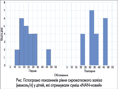 Рівень сироваткового заліза після застосування суміші зріс з 26,8±4,6 до 36,5±4,2 мкмоль/л (p<0,05). У другій групі та в контрольній він був відповідно 28,6±3,2 та 35,4±5,2 мкмоль/л. Як видно з гістограми, після місячного вигодовування сумішшю «NAN-новий» у жодної дитини не було показника нижче за 20,0 мкмоль/л (рис.). Якщо врахувати, що діти першої групи отримували за добу в середньому 7,2 мг заліза, а діти другої — 8,3 мг, то стає очевидною більш висока біодоступність заліза із суміші «NAN-новий». Таким чином, не тільки суплементація чи фортифікація залізом сумішей сприяє боротьбі із залізодефіцитними станами, але й кращому його засвоєнню організмом.