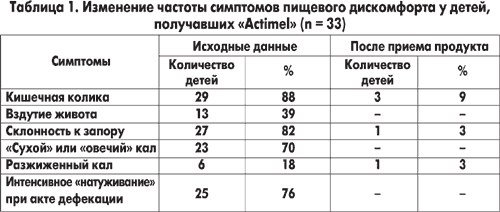 На фоне приема «Actimel» отмечено значительное улучшение общего состояния всех наблюдавшихся детей. Болевой синдром купировался у 26 детей, исчезли вздутия живота. У преобладающего числа детей (28-85%) уже с второго-четвертого дня от начала приема продукта были отмечены улучшение консистенции каловых масс (более мягкие, влажные) и регулярная дефекация один раз в день, без «натуживания», что устойчиво сохранялось в течение всего периода наблюдения. Склонность к запору к концу исследования оставалась только у одного ребенка.