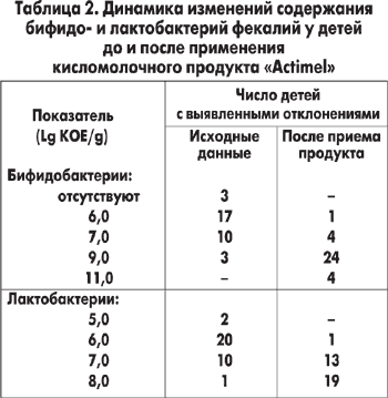 В заключительных исследованиях отмечено достоверное повышение до нормального уровня популяции бифидо- и лактобактерий, соответственно, у 83% и 95% детей, имевших исходно сниженный уровень этих бактерий (табл. 2).