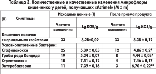 Таким образом, полученные результаты свидетельствуют, что кисломолочный продукт «Actimel» является достаточно эффективным продуктом функционального питания. Он оказывает выраженное положительное влияние на общее и эмоциональное состояние детей, аппетит, соматические показатели и способствует убыванию симптомов пищеварительного дискомфорта, обусловленного дисбактериозом кишечника. Включение кисломолочного продукта «Actimel» в рационы питания детей с явлениями кишечного дисбиоза приводит к увеличению популяции бифидо- и лактофлоры, уменьшению степени колонизации, вплоть до полной элиминации условнопатогенных бактерий, таких как стафилококки, грибы рода Кандида, стрептококки, представители рода энтеробактерий, клебсиелла. Использование кисломолочного продукта с пробиотическими свойствами у детей с функциональными запорами способствует нормализации консистенции стула и частоты дефекации.