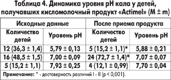 Результаты динамических микробиологических исследований позволяют сделать вывод о том, что положительное влияние нового кисломолочного продукта «Actimel», с большей вероятностью, обусловлено поступлением пробиотических культур в пищеварительный тракт в жизнеспособном состоянии. Это сокращает латентный период действия пробиотических культур, обусловленный выходом бактерий из состояния анабиоза, вызванного лиофилизацией, что наблюдается при применении сухих (лиофилизированных) биопрепаратов. Важно подчеркнуть, что вместе с продуктом, обладающим пробиотическим действием, ребенок получает комплекс биологически активных веществ, улучшающих функционирование системы пищеварения [6]. Этот факт подтверждается нашими исследованиями уровня рН копрофильтратов у наблюдавшихся детей. Как видно из данных, представленных в таблице 4, нормальный (нейтральный) уровень рН кала в исходном исследовании был у 16 (48%) детей, слабокислая реакция — у 12 (36%) детей, слабощелочная — у 5 детей.