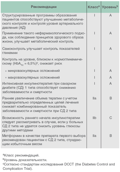 Структурированные программы образования пациентов способствуют улучшению метаболического контроля и контроля уровня АД (класс I, уровень доказательности A).