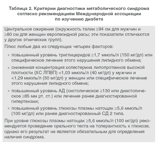 Конкретные рекомендации включают физические нагрузки в течение 30 мин не менее пяти раз в неделю, ограничение потребления калорий до 1500 ккал в день, а также жиров до 30-35% от общей калорийности ежедневного рациона (10% из них должны составлять мононенасыщенные жирные кислоты, например оливковое масло), увеличение потребления клетчатки до 30 г в день, исключение из рациона транс-изомеров жирных кислот, а также моно- и дисахаридов в жидкостях.