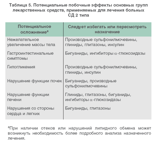 К сожалению, только у незначительного количества больных, принимавших участие в таких исследованиях, как UKPDS или Steno 2, в течение последующего длительного периода наблюдений удалось поддерживать рекомендуемые уровни глюкозы. Наибольшее достижение в лечении СД 2 типа за последние годы – внедрение подхода, основанного на одновременном назначении нескольких лекарственных средств, первоначально предложенного авторами UKPDS. Концепция ранней комбинированной терапии была выдвинута с целью повышения эффективности лечения и минимизации его побочных эффектов. Она основана на том факте, что средняя доза препарата обеспечивает около 80% глюкозоснижающего действия, при этом имеет минимальные потенциальные побочные эффекты, такие как увеличение массы тела, симптомы со стороны желудочно-кишечного тракта, а также риск возникновения гипогликемии. Данный подход подразумевает раннее начало инсулинотерапии в случае, если применение пероральных глюкозоснижающих препаратов в соответствующих дозах и комбинациях на фоне соблюдения принципов здорового образа жизни не дает желаемого эффекта. Показатель ИМТ, а также риск возникновения гипогликемии, почечной и сердечной недостаточности – это главные факторы, определяющие выбор стратегии лечения (табл. 5).