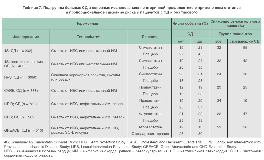 До сегодняшнего дня не было проведено каких-либо значительных исследований по вторичной профилактике в разных подгруппах больных СД. Тем не менее данные post hoc-анализа подгрупп среди более чем 5000 пациентов с СД, включенных в основные испытания, убедительно свидетельствуют о том, что влияние вторичной профилактики на снижение частоты случаев ИБС и инсульта у больных СД сходно с таковым у лиц, не страдающих диабетом.