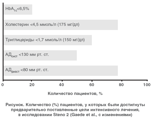 Недавно полученные результаты метаанализа, в который были включены данные 1800 больных СД 1 типа и 4472 пациентов с СД 2 типа, убедительно продемонстрировали, что поддержание показателей гликемии в пределах нормы ведет к существенному снижению комбинированной частоты любого сердечно-сосудистого события до 0,38 (95% доверительный интервал [ДИ] 0,26-0,56) при СД 1 типа и 0,81 (95% ДИ 0,73-0,91) при СД 2 типа. В исследовании Steno 2 использовался мультифакторный подход к терапии, направленной на достижение целевого уровня HbA1c ниже 6,5% по сравнению с 7,5% в контрольной группе. Разница между группами по данному показателю составила приблизительно 0,8%. Исследователи отмечают значительное снижение риска сердечно-сосудистых событий среди пациентов основной группы на протяжении 7,8 года. Ключевым критерием включения в исследование Steno 2 было наличие микроальбуминурии. Ежегодный скрининг на наличие микроальбуминурии является обязательным для всех больных СД, поскольку позволяет выявить лиц с особо высоким риском ССЗ и с учетом этого достигнуть желаемых результатов лечения.