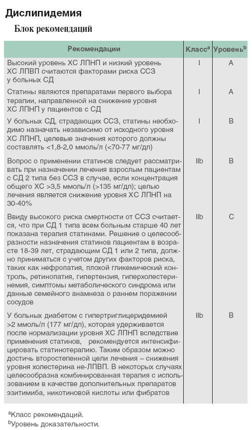 У больных СД, страдающих ССЗ, статины следут назначать независимо от исходного уровня ХС ЛПНП, а его целевые значения должны составлять <1,8-2,0 ммоль/л (<70-77 мг/дл) (класс I, уровень доказательности В).