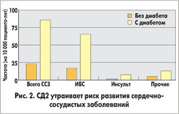 Инсулинорезистентность — независимый фактор риска развития сердечно-сосудистых заболеваний (ССЗ), который обусловливает столь высокую частоту сердечно-сосудистых происшествий у больных СД2. В среднем, относительный риск развития ССЗ у пациентов с СД2 в 3 раза выше, чем в популяции (рис. 2).