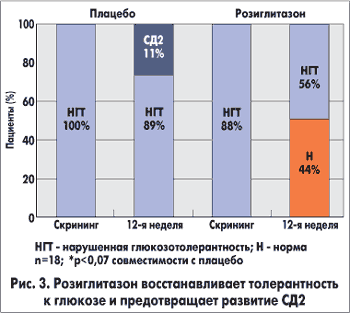 Отчасти столь малоутешительные результаты связаны с недостаточным комплайенсом в лечении больных СД2, отчасти — с недостатком профилактических мер. Среди средств профилактики особый акцент делается на изменении образа жизни, коррекции питания и режиме физических нагрузок. Помимо этого активно изучается профилактическое действие различных групп препаратов (иАПФ, антагонисты РАII, бигуаниды, глитазоны) в группе риска — больные с нарушенной толерантностью к углеводам — с целью предотвращения развития СД. Наиболее многообещающие результаты демонстрируют глитазоны. В исследовании TRIPOD было достигнуто снижение на 56% заболеваемости СД2 (Diabetes Care, Vol 26, Suppl.1 S62-69. January 2003). В подобном исследовании применение розиглитазона позволило восстановить нормальную толерантность к углеводам и предотвратить развитие СД2 (рис. 3) (Elasha H. et al. Diabetologia 2001; 44 (Suppl 1) : A221).
