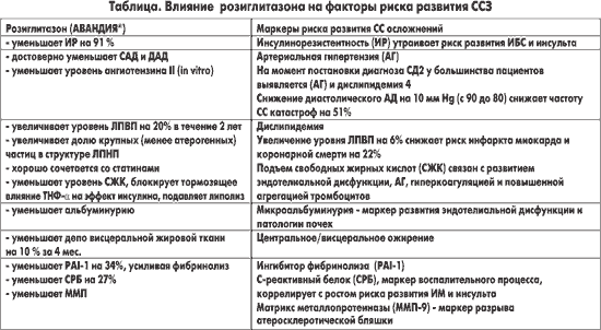 Таблица. Влияние розиглитазона на факторы риска развития ССЗ