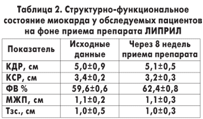 На фоне приема препарата ЛИПРИЛ по результатам двухмерной эхокардиографии была установлена тенденция к повышению сократительной способности левого желудочка (ЛЖ), что проявилось в увеличении фракции выброса на 5,3% и уменьшении конечно-систолического объема ЛЖ на 7,2% (табл. 2). Остальные показатели структурно-функционального состояния миокарда оставались без динамики, что может быть связано с недостаточно длительным сроком приема препарата.