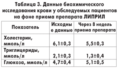 Таким образом, результаты острого и хронического фармакологического тестов свидетельствуют о выраженном антигипертензивном эффекте препарата ЛИПРИЛ и его хорошей переносимости (побочный эффект в виде сухого кашля отмечался у одного пациента), об отсутствии негативного влияния на состояние углеводного и липидного обменов и позитивном влиянии на сократительную способность миокарда. Все вышесказанное позволяет считать ЛИПРИЛ препаратом выбора при лечении артериальной гипертензии у больных, страдающих метаболическим синдромом.