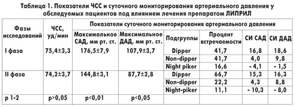 Анализ полученных данных продемонстрировал отсутствие значимого влияния исследуемого препарата на ЧСС у пациентов на протяжении двухмесячного приема (p> 0,05). Убедительные результаты получены при оценке антигипертензивного действия лизиноприла на показатели максимальных значений АД, суточного профиля АД у пациентов при проведении суточного мониторирования АД в исходе и конце лечения. Отмечается достоверное уменьшение (p<0,05) максимальных значений систолического и диастолического АД в конце 8-недельного курса лечения лизиноприлом по сравнению с исходными показателями (табл. 1). Среднесуточное снижение максимальных значений систолического и диастолического АД составило 17,8% и 20,8% соответственно. Обращает на себя внимание положительное влияние данного препарата на показатели суточного профиля АД. Так, процент пациентов, у которых до начала лечения отмечался суточный тип кривой «non-dipper», уменьшился к концу исследования с 41,7 до 22,2%, а пациентов с «night piker» сократился с 16,6 до 11,1%. Однако необходимо отметить, что последняя категория пациентов была самой тяжелой в клиническом плане и для достижения положительного антигипертензивного эффекта им требовались более высокие дозы лизиноприла (25 мг в сутки), а иногда и двухразовый прием (20 мг 2 раза в день).