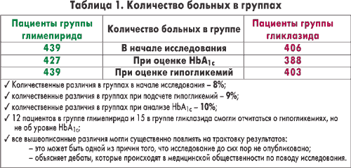 На первый взгляд, обращает на себя внимание тот факт, что количество больных в группах глимепирида и гликлазида MR существенно отличалось, более того, оно было различным при анализе различных показателей. Причины такого рода различий неизвестны, однако являются непонятными с точки зрения серьезности и масштабности такого европейского исследования (табл. 1).