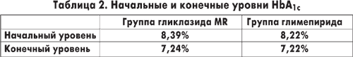 По неизвестным причинам количество больных в группах для сравнения по главному параметру исследования было разным и отличалось более чем на 10%. Тем не менее, полученные результаты снижения уровня НbА1с в группе глимепирида и гликлазида достоверно не отличались. Для практикующего врача важно знать не только конечные, но и начальные уровни НbА1с в группах, так как на практике известно, что чем ниже начальный уровень НbА1с, тем тяжелее добиться его снижения (табл. 2).
