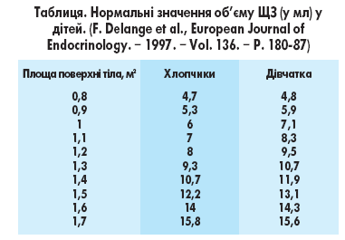 3.4. У дітей найдоцільніше використовувати нормативи об’єму ЩЗ, розраховані відносно площі поверхні тіла. Верхня межа нормальних значень (97 перцентиль) об’єму ЩЗ (у мл) із розрахунку на площу поверхні тіла в дітей, які проживають за умов нормального йодного забезпечення, представлена в таблиці.