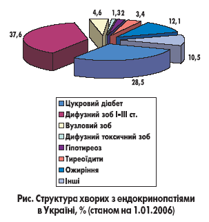 Патологія ендокринної системи посідає одне з провідних місць у структурі загальної захворюваності населення. В Україні спостерігається зростання кількості хворих із різними ендокринопатіями. Так, у 1993 р. таких хворих було зареєстровано 1 769 626, а в 2005 р. – 3 527 022, тобто вдвічі більше, що передусім пов’язано із введенням у 1999 р. Міжнародної класифікації хвороб десятого перегляду, де чітко визначено структуру патології щитоподібної залози. Крім того, кількість хворих збільшилася за рахунок проведення профілактичної роботи з раннього активного виявлення осіб із ендокринопатіями.