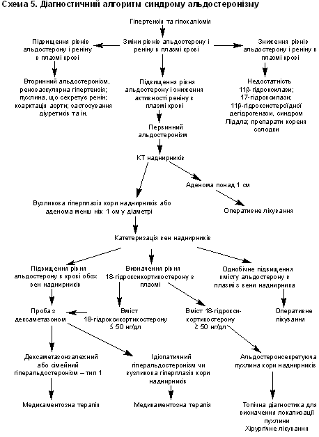 У разі підозри на альдостерому проводять диференціальну діагностику з синдромом Біглієри (дефект 17β-гідроксилази) та ін. Гіпертензивними формами адреногенітального синдрому – ВДКН, із феохромоцитомою (значне підвищення катехоламінів і ВМК у сечі та крові), глюкортикоїдною гіпертензією при синдромі Іценка-Кушинга (див. схеми 3 і 5), гіпертензією при гіпоталамічному синдромі, патології нирок, тиреотоксикозі (схема 5). Часто гіпертензія розвивається при довготривалому вживанні препаратів кореня солодки, ртутних паст і мазей тощо.