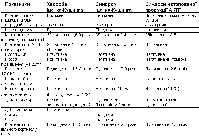Диференціальну діагностику пухлин кори наднирників передусім проводять із хворобою Іценка-Кушинга й АКТГ-ектопованим синдромом.