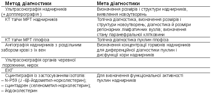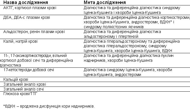 Алгоритм діагностики пухлин наднирників представлений на схемі 1. На першому етапі аналізу скарг пацієнта ендокринолог з’ясовує наявність характерних ознак гіперкортицизму (схема 2). Якщо виявляють дві й більше ознак гіперкортицизму (див. схему 2), то призначають додаткове гормональне і параклінічне обстеження (див. схему 1). Алгоритм діагностики синдрому Іценка-Кушинга представлений на схемі 3.