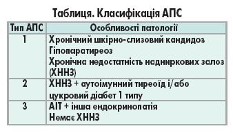 АПС-1 – це захворювання, що виникає рідко, дещо вищу його частоту фіксують у Фінляндії (1:25 000), в популяції іранських євреїв (1:9000) і в мешканців Сардинії (1:12 500). АПС-1 характеризується поліорганним ураженням, спричиненим аутоімунними механізмами [2]. При АПС-1 вражаються переважно ендокринні органи, розвивається гіпопаратиреоз, недостатність надниркових та статевих залоз, цукровий діабет, гіпотиреоз. Неендокринні прояви захворювання – аутоімунний гепатит, вітиліго, перніціозна анемія, екзокринна недостатність підшлункової залози, алопеція. Перший прояв АПС-1 – зазвичай шкірно-слизовий кандидоз – найімовірніше пов’язаний з дисфункцією Т-клітин. Тип успадкування АПС-1 аутосомно-рецесивний, викликаний мутацією в гені за назвою AIRE. Ген складається з 14 екзонів, розташований на довгому плечі 21 хромосоми (21q22.3) і кодує білок. Функція цього білка на сьогодні не відома, але зважаючи на структуру, його можна віднести до групи регуляторів транскрипції. Ген AIRE експресований переважно в тимусі, макрофагах і дендритних клітинах. Нині відомо понад 50 мутацій гена AIRE [1, 2]. Хоча переважна більшість мутацій успадковується рецесивним шляхом, є докази домінантного успадкування деяких мутацій (наприклад G228W) [3]. Генотип AIRE – не єдина детермінанта фенотипу хворих з АПС-1. Виявлено, що детермінантою фенотипу пацієнтів (комбінації можливих компонентів синдрому) виступає також HLA класу II [4].