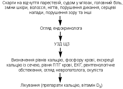 Огляд ендокринолога, визначення рівнів кальцію, фосфору, ПТГ крові, екскреції кальцію із сечею, ЕКГ, огляд окуліста, невропатолога.