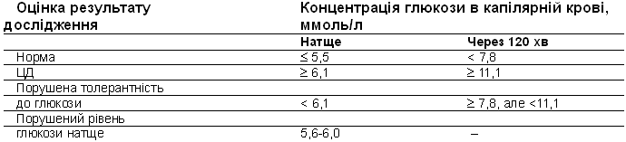 ≥ 11,1 ммоль/л, це свідчить про наявність ЦД. Якщо глікемія натще вище 5,5 ммоль/л, але менше 6,1 ммоль/л, а через 2 год перебуває у межах 7,8-11,1 ммоль/л, це свідчить про порушення толерантності до глюкози, що можна трактувати як латентний ЦД. Рівень глюкози крові натще в межах 5,6-6,0 ммоль/л трактується як порушення глікемії натще. Таких осіб відносять до групи ризику. В осіб віком понад 60 років на кожні наступні 10 років до одержаних показників глікемії додають 0,1 ммоль/л. Метод тестування безпечний і дешевий, ефективність значна.
