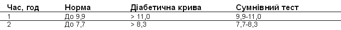 Проба вважається патологічною (діабет), якщо показники глікемії через 1 год після приймання глюкози перевищують 11 ммоль/л (200 мг%), через 2 год – 8,32 ммоль/л і більше.