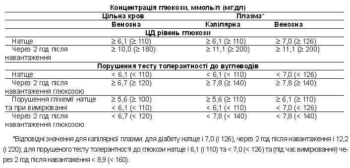 Критерії діагностики ЦД та інших категорій гіперглікемії (ВООЗ, 1999)