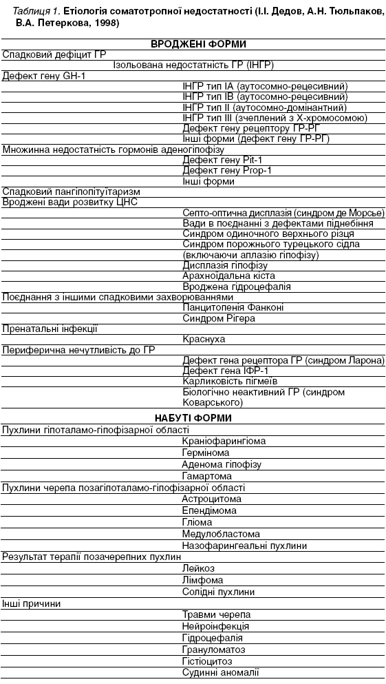 Найбільш сучасні уявлення про етіологію соматотропної недостатності подані в таблиці 1.