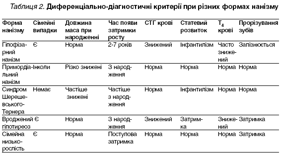 Таблиця 2. Диференціально-діагностичні критерії при різних формах нанізму