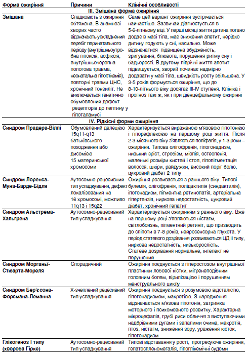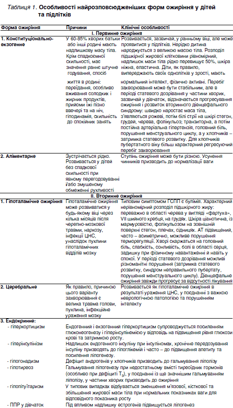 Таблиця 1. Особливості найрозповсюдженіших форм ожиріння у дітей та підлітків (частина 1, частина 2)