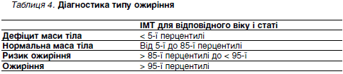 Таблиця 4. Діагностика типу ожиріння Абдомінальний (андроїдний) тип ожиріння діагностують, якщо індекс ОТ/ОС для хлопців > 0,9; для дівчат > 0,8.