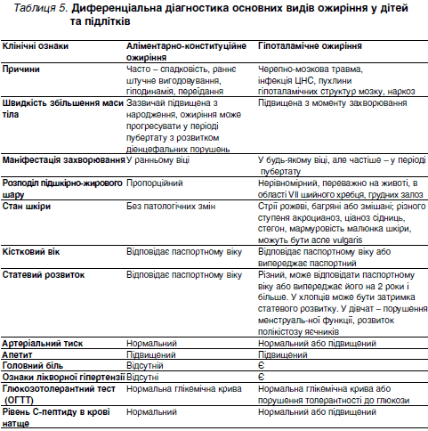 Таблиця 5. Диференціальна діагностика основних видів ожиріння у дітей та підлітків