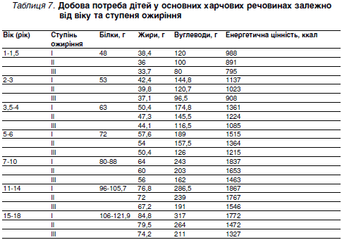 Таблиця 7. Добова потреба дітей у основних харчових речовинах залежно від віку та ступеня ожиріння