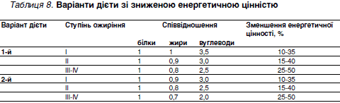 Таблиця 8. Варіанти дієти зі зниженою енергетичною цінністю