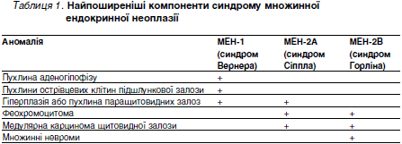 Синдроми МЕН класифікують за основними клінічними проявами. Найпоширеніші компоненти цих синдромів подані в таблиці 1.