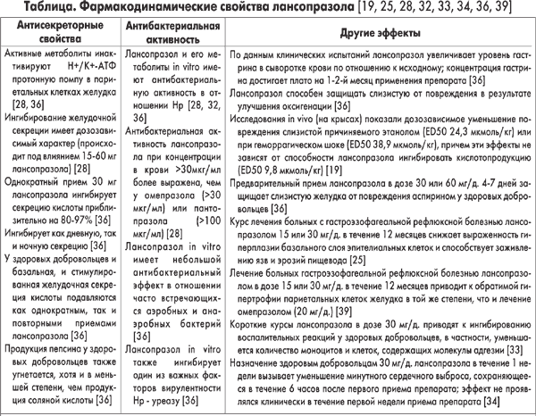 Основные данные литературы о фармакодинамических и терапевтических свойствах лансопразола представлены в таблице.