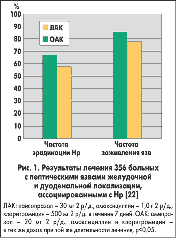 Лансопразол обладает гастропротективным действием, так как повышает оксигенацию слизистой желудка, стимулирует выработку бикарбонатов, тормозит синтез пепсина [10, 27, 35]. В лечении длительно незаживающих язв желудка лансопразол более эффективен, чем омепразол: заживление через 8 недель происходит соответственно у 93% и 82% больных. Лансопразол способствует также более быстрому заживлению дуоденальных язв (заживление через 2 недели наступает у 74% пациентов, получавших лансопразол, и только у 53% пациентов, лечившихся омепразолом [12, 21]). Результаты одного из сравнительных исследований, оценивающих эффективность лансопразола и омепразола в эрадикации Нр и заживлении желудочных и дуоденальных язв представлены на рисунке 1.