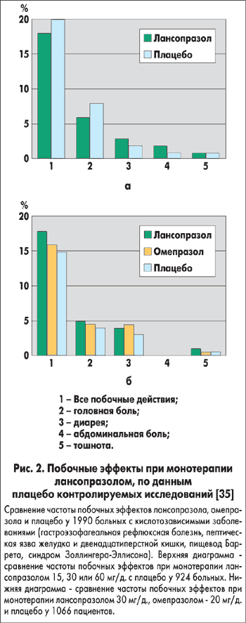 Безопасность лечения лансопразолом изучалась в целом ряде исследований. Наиболее крупным из них является исследование J. W. Freston et al. (1999) [35], результаты которого представлены на рисунке 2. Фармако-экономические исследования показали, что тройная эрадикационная терапия лансопразолом, амоксициллином и кларитромицином является экономически обоснованной и целесообразной при оценке соотношения стоимость/клинический эффект [37].