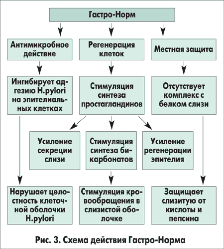 В течение многих лет для лечения пептических язв, в том числе ассоциированных с Нр, применяются препараты на основе солей висмута. Наиболее эффективным из них является коллоидный субцитрат висмута, на основе которого был создан отечественный препарат Гастро-Норм (АО «Галичфарм»). Коллоидный субцитрат висмута имеет наименьшую, по сравнению с другими солями, ингибирующую Нр концентрацию — 4-32 мг/л [7]. Препарат обладает тройным действием: антихеликобактерным, репаративным, местным защитным (рис. 3). Бактерицидное действие Гастро-Норма в отношении Нр объясняется тем, что препарат, хорошо растворяясь в желудочном соке и слизи, проникает в слой желудочной слизи и желудочные ямки, влияет на Нр, который адгезирован на поверхности клеток. Под действием коллоидного висмута Нр утрачивает способность к адгезии, развивается вакуолизация и фрагментация клеточной мембраны бактерии, конденсация клеточного содержимого, инактивация ферментных систем (ингибирование уреазы, каталазы, липазы Нр), нарушается метаболизм возбудителя. В результате Нр становится нежизнеспособным и чувствительным к иммунологической защите организма человека [1, 4]. Штаммов Нр, резистентных к коллоидному висмуту, не выявлено [14]. Важно, что активность коллоидного висмута в кислой среде желудка даже возрастает, в отличие от многих других антихеликобактерных средств [3, 4]. Однако частота эрадикации Нр при монотерапии коллоидным висмутом не превышает 30% в связи с тем, что большая часть препарата связывается с желудочной слизью, и в глубине желудочных ямок (где находится значительное количество Нр) не создается достаточной концентрации препарата [5]. Следовательно, Гастро-Норм необходимо комбинировать с другими средствами эрадикационной терапии.