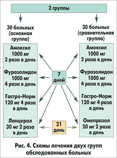 Больные были разделены на 2 группы (основную и группу сравнения) по 30 пациентов в каждой. Лечение состояло в проведении эрадикационной терапии второй ступени в течение 7 дней с последующим приемом ИПП еще в течение 21 дня. Больные основной группы получали Ланцерол (ОАО «Киевмедпрепарат»), а группы сравнения — омепразол (того же производства) (рис. 4). В обоих схемах использовали Амоксил-КМП — амоксициллин производства ОАО «Киевмедпрепарат».