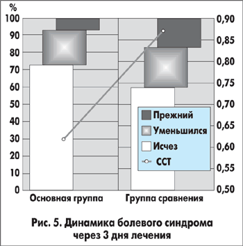 За первые 3 дня лечения ССТ пальпаторной болезненности в основной группе снизилась на 0,34, а в группе сравнения — на 0,18.