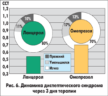 Аналогичная тенденция отмечалась и в отношении диспептического синдрома (рис. 6). За первые 3 дня лечения частота исчезновения диспепсии в основной группе составила 80,0%, диспептические явления уменьшились в 10,0%, остались прежними — в 10,0% случаев. Среди больных группы сравнения динамика была менее отчетливой: диспепсия исчезла в 70,0%, уменьшилась в 16,7%, осталась прежней в 13,3% случаев. ССТ диспептического синдрома через 3 дня терапии у больных основной группы составила 0,54, среди больных группы сравнения — 0,71.