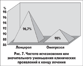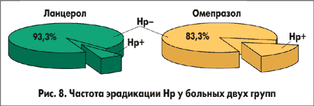 Частота эрадикации Нр в основной группе, т. е. у больных, получавших в качестве ИПП Ланцерол, составила 93,3%, а в группе сравнения (пациенты, получавшие омепразол) — 83,3%. Эрадикация Нр не была достигнута у двух пациентов основной группы и у пяти пациентов группы сравнения (рис. 8).