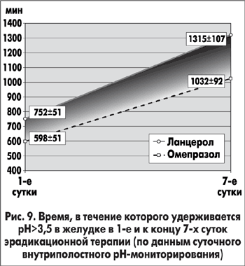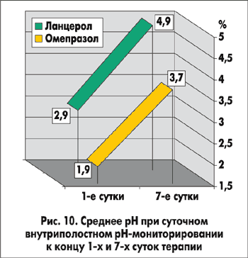При проведении суточного рН-мониторирования оказалось, что к концу первых суток терапии при применении Ланцерола уровень рН>3,5 в желудке удерживался 752±51 мин, а при использовании омепразола — 598±45 мин (p<0,05). Причем средняя рН в желудке к концу первых суток лечения у больных основной группы — 2,90±0,30, а у больных группы сравнения — 1,90±0,38 (p<0,05). Через 7 суток терапии рН>3,5 в желудке удерживалась среди больных основной группы в течение 1315±107 мин, а среди больных группы сравнения — в течение 1023±92 мин (p<0,05), а средние значения рН к концу лечения составили соответственно 4,90±1,10 и 3,70±1,20 (p>0,05) (рис. 9, 10).