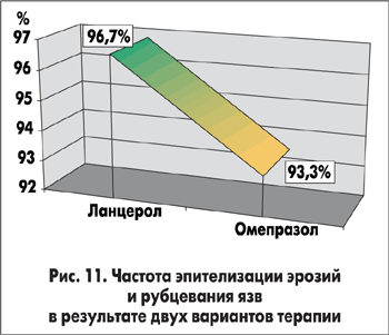 Эффективность, безопасность и хорошая переносимость Ланцерола при язвенной болезни желудка и двенадцатиперстной кишки доказаны исследованиями отечественных гастроэнтерологов [16]. Так, при лечении Ланцеролом в течение 4 недель достигнута отчетливая положительная динамика клинических проявлений заболевания; заживление язв и эрозий произошло во всех случаях. Авторы показали выраженный антисекреторный эффект Ланцерола (интрагастральное рН достигало 3,4±0,3) [16].