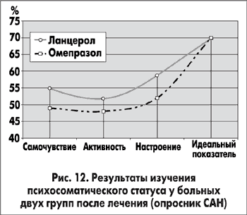 Оценка психосоматического статуса после лечения (изучался по опроснику САН) также показала преимущества эрадикационной схемы с использованием Ланцерола (рис. 12). Так, свое самочувствие больные основной группы оценили в 55±4 балла, а больные группы сравнения — в 49±5 баллов. Активность, по мнению пациентов основной группы после лечения, составила 52±3 балла, а у больных группы сравнения — 48±4 балла. Настроение больные основной группы после лечения оценили в 59±4 балла, а больные группы сравнения — в 52±6 баллов (идеальные показатели для всех трех параметров составляют по 70 баллов). Все же следует учитывать, что разница результатов опросника САН у больных двух групп была недостоверной.