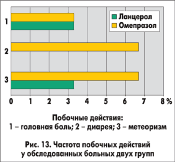 Преимущества Ланцерола (лансопразола) перед омепразолом состоят в большей биодоступности (соответственно 81-91% и 30-65%), в достижении большей концентрации в плазме крови (максимальная концентрация в крови для Ланцерола 0,75-1,15 мг/л, для омепразола — 0,56-1,00 мг/л). Кроме того, лансопразол быстрее достигает максимальной концентрации в плазме крови — за 1,5-2,0 ч (омепразол — за 3-4 ч), то есть его эффект реализуется быстрее. Период полувыведения лансопразола — 1,3-3,0 ч, омепразола — 0,5-1,2 ч, то есть лансопразол дольше удерживает терапевтическую концентрацию в крови. Лансопразол имеет 4 участка связывания в париетальной клетке, тогда как омепразол — только 3 [2, 6]. Степень антисекреторного эффекта лансопразола в 2,4 раза выше, чем у омепразола, поэтому лансопразол обладает более мощным свойством подавления желудочной секреции [17]. И, что особенно важно, минимальная ингибирующая Нр концентрация лансопразола (6,25 мг/л) значительно меньше, чем у омепразола (50,0 мг/л). Этим объясняется более высокая антихеликобактерная активность лансопразола [2, 10, 24, 38].