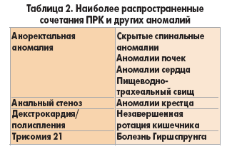 Важно учитывать, что многие ПРК сочетаются друг с другом и с другими аномалиями, т. е. при выявлении одной аномалии следует обследовать пациента для возможного обнаружения другой аномалии (табл. 2).
